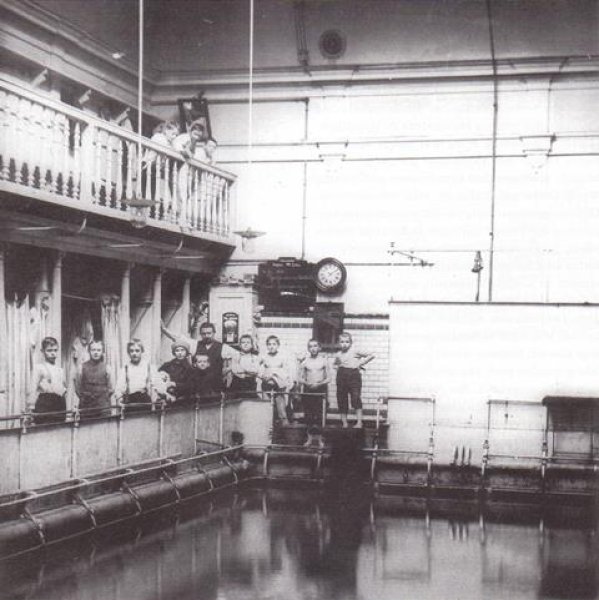 Die Beleuchtung erfolgte durch die Oberfenster und abends mittels Gasbeleuchtung. Ein Rad diente zur Wellenerzeugung. Somit war es das modernste Hallen-Schwimmbecken seiner Zeit.